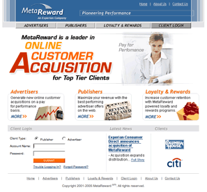 Project Description: This project was a redesign of MetaReward's corporate web site. They wanted a clean look that easily conveyed what we did as a company. They also wanted the infomation for three offerings to be easily accessible.
