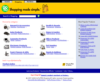 The GoTo.com shopping site was developed after GoTo acquired Cadabra.com. Cadabra was an online comparison shopping site that had it's own branding and business model. After being acquired we took the basic layout and functionality of the Cadabra site and incorporated the GoTo branding and interface elements.