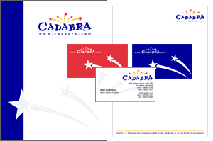 Project Description: Cadabra's print collateral plays up the excitement of the logo. The vibrant colors made the folders and business cards stand out. The business cards were two different colors on the back side.