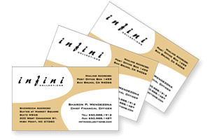 Project Description: Infini Collections needed business cards for an upcoming tradeshow. Their export furniture business had a lot of swooping curves and lines in the designs. I used this design element and featured that feeling into the card art.